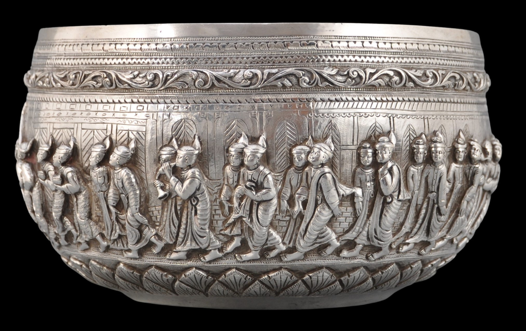 This fine Burmese silver bowl is repoussed all the way around with one single processional scene of no less than 34 participants.